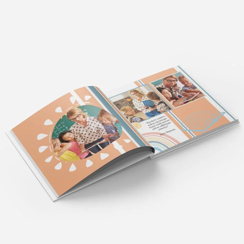 Odkrijte, kako preprosto je oblikovati fotoknjigo z izbrano predlogo. Predloga je primerna predvsem za darilo učiteljici, učitelju, saj je poleg barvitih grafik opremljena tudi s simpatičnimi citati o poučevanju. Seveda lahko predlogo poljubno prilagodite tudi za kakšno drugo priložnost, ki kliče po razgibanih ter energičnih sličicah in preprostim dizajnom.
