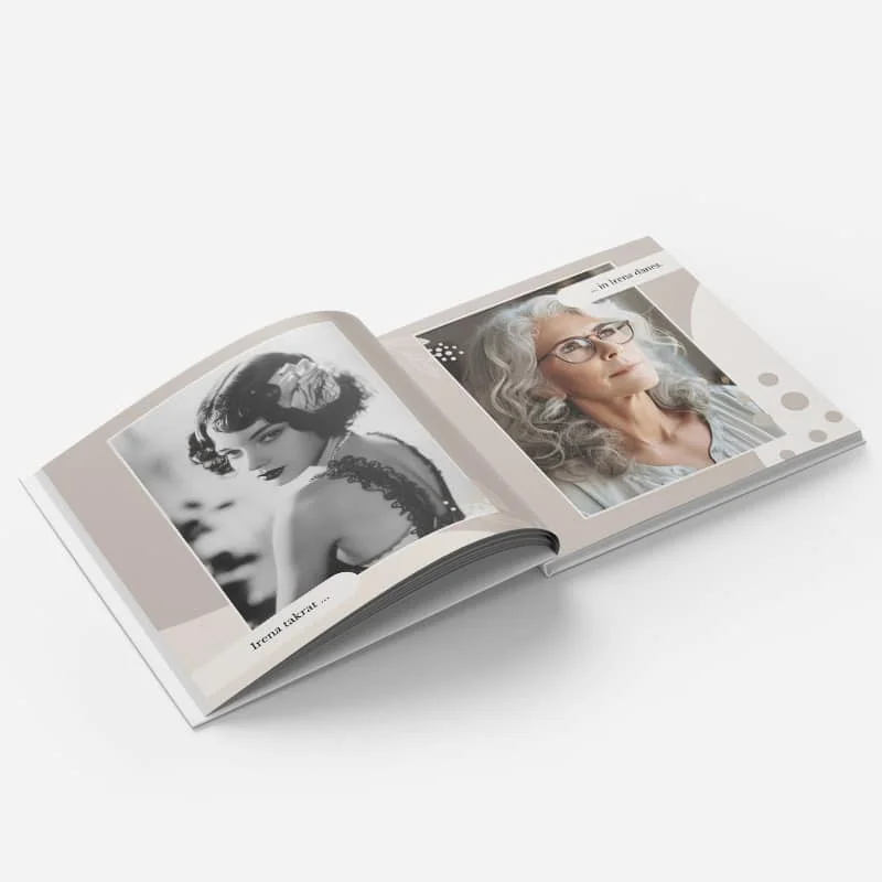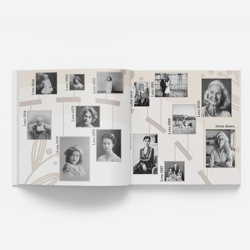 Odkrijte, kako preprosto je oblikovati fotoknjigo z izbrano predlogo. Predloga ima na drugi in tretji stran oblikovan nekakšen časovni trak, na katerega lahko nanizate življenjsko zgodbo v fotografijah in le te opremite z letnicami ali drugimi komentarji. Tako je predloga primerna za darilo ob obletnici, morda ob upokojitvi, kot spomin na določeno obdobje v življenju ali kot spominska knjiga vam ljube osebe.