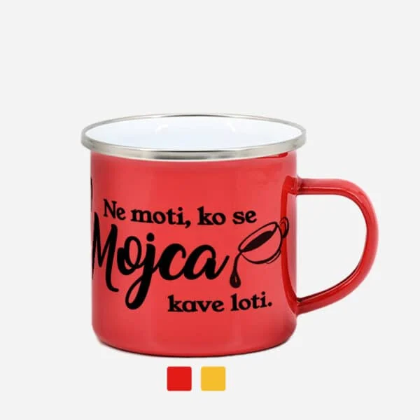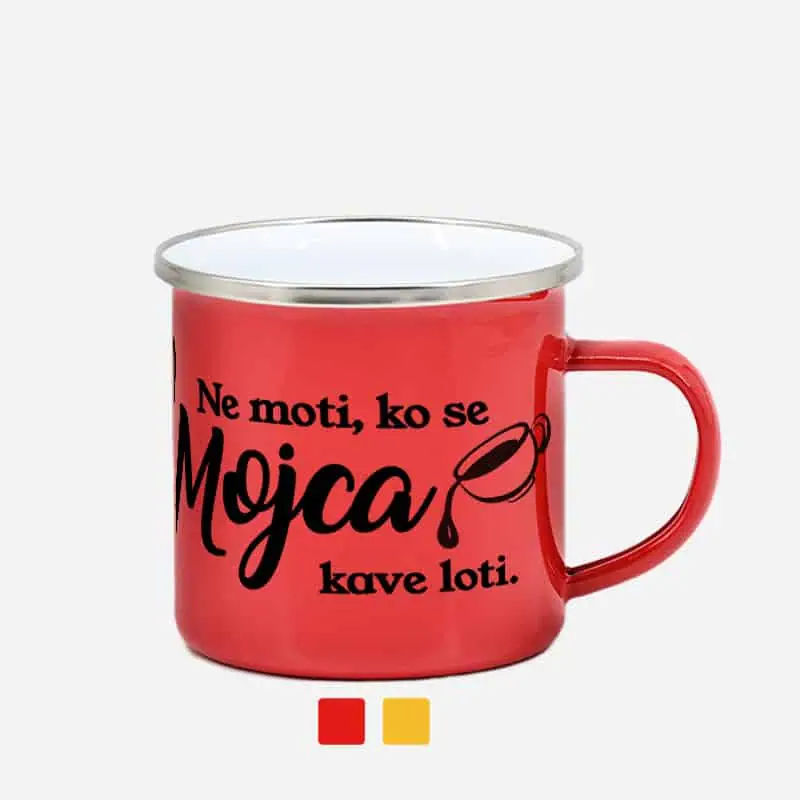 Barvni emajliran lonček ta čudovita skodelica ni le za pitje kave, ampak v njej lahko tudi pripravite svojo najljubšo kavo. Priporočamo tisk grafike v močnih barvah, kot so črna, rdeča in modra, saj nežnejše barve zaradi barve lončka ne bodo prišle do izraza. Tiskanje fotografij na tem lončku ni priporočljivo.