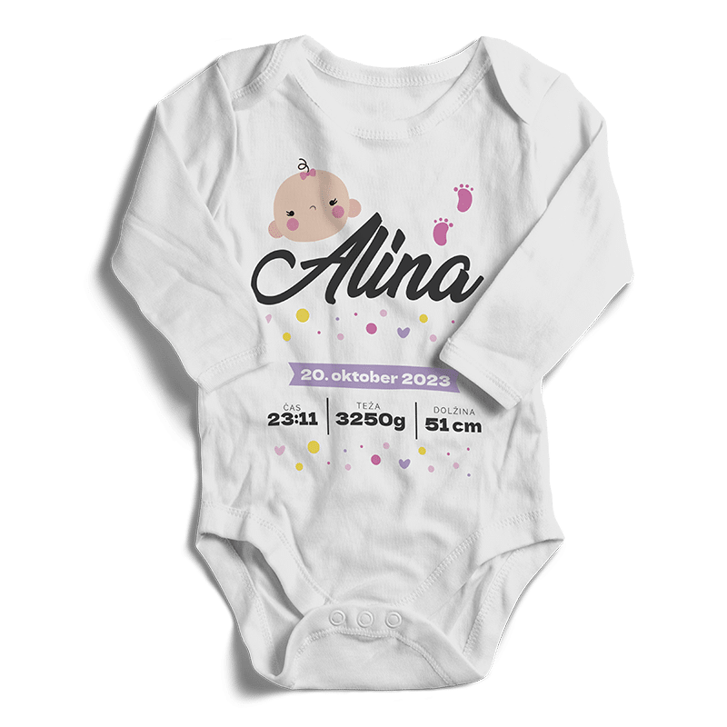 Na voljo so štiri različne barve bodijev, tako z dolgimi kot tudi kratkimi rokavi, da lahko izberete tistega, ki najbolje ustreza vašim potrebam. Za vašega malčka pripravimo unikaten bodi, ki bo zagotovo izstopal in mu dodal poseben čar, kasneje pa ga lahko shranite in tako vam bo ostal trajen spomin na čas, ko je bil vaš otrok še drobcen dojenček.