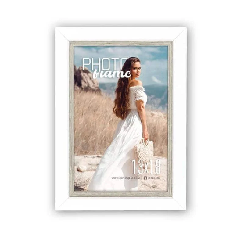 Zunanji rob je širok in raven, v snežno beli barvi, notranji rob pa je poudarjen s tanko, svetlo sivo-rjavo obrobo z izrazito strukturo lesa. Ta detajl daje okvirju topel in prefinjen značaj.