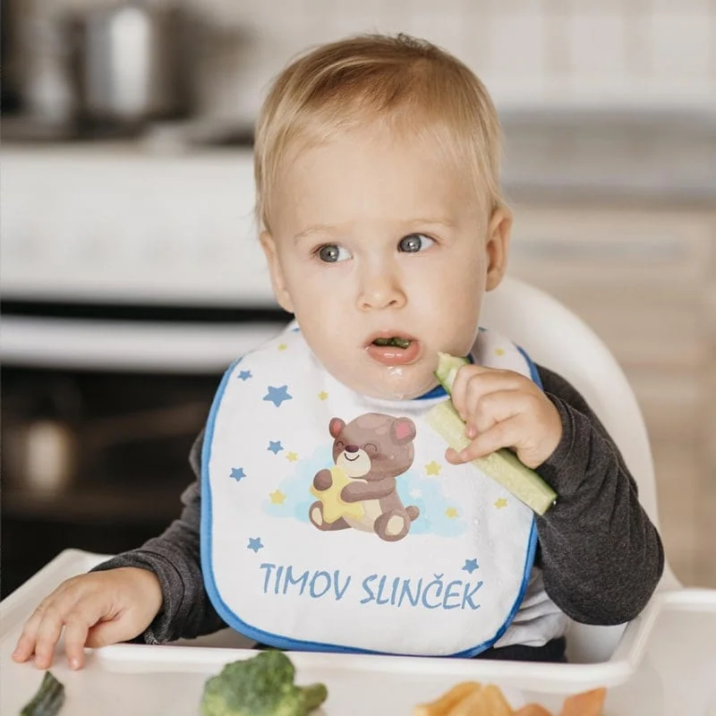 Naš slinček je posebej oblikovan za male junake in junakinje. Sprednji del slinčka je gladek, kar omogoča odličen odtis na vašem malčku, medtem ko je zadnji del izdelan iz mehkega frotirja, ki nudi udobje in zaščito.