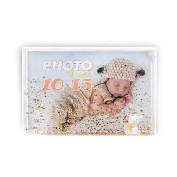 Ta eleganten okvir, napolnjen z vodo in zlatimi bleščicami, ob vsakem tresljaju ustvari čaroben lesketajoč učinek, ki vašo ležečo fotografijo velikosti 10×15 cm spremeni v pravi praznik za oči.
